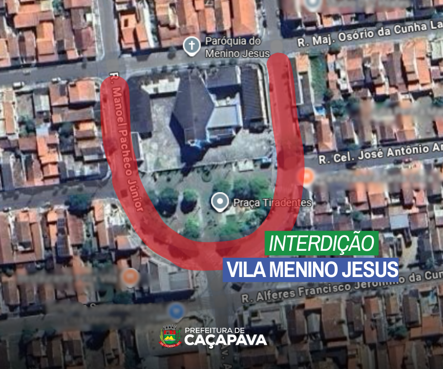 A Prefeitura de Caçapava informa que, em razão da realização da Festa em Louvor ao Menino Jesus, algumas vias da Vila Menino Jesus serão interditadas em dias específicos do evento para garantir a segurança dos participantes e a organização do tráfego no entorno.