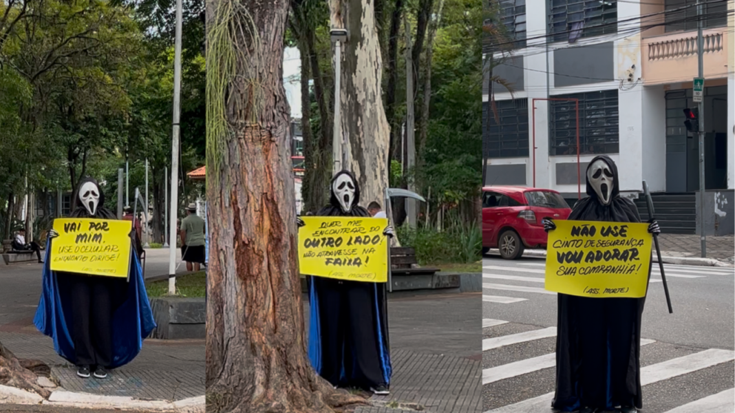 Como parte da campanha Maio Amarelo, a Prefeitura de Caçapava realiza, entre os dias 12 e 19 de maio, uma intervenção urbana marcante na Praça da Bandeira. A ação chama a atenção de pedestres e motoristas ao colocar em cena a figura simbólica da “morte” segurando uma placa de alerta. O objetivo é provocar reflexão sobre os riscos no trânsito e reforçar a importância de atitudes seguras para salvar vidas.