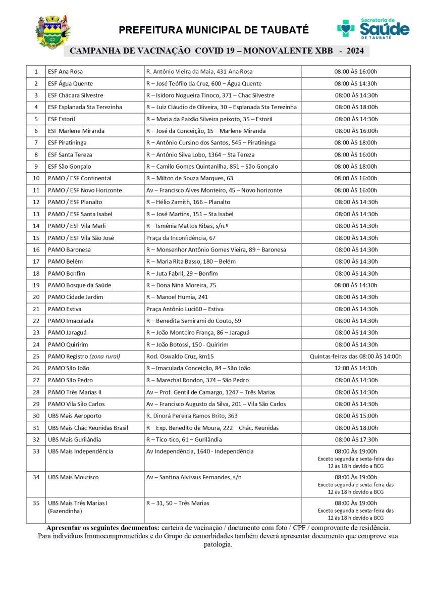 Para se vacinar é necessário apresentar os seguintes documentos: carteira de vacinação, documento com foto, CPF e comprovante de endereço. Os indivíduos imunocomprometidos e do grupo de comorbidades também deverão apresentar documento que comprove sua patologia.
